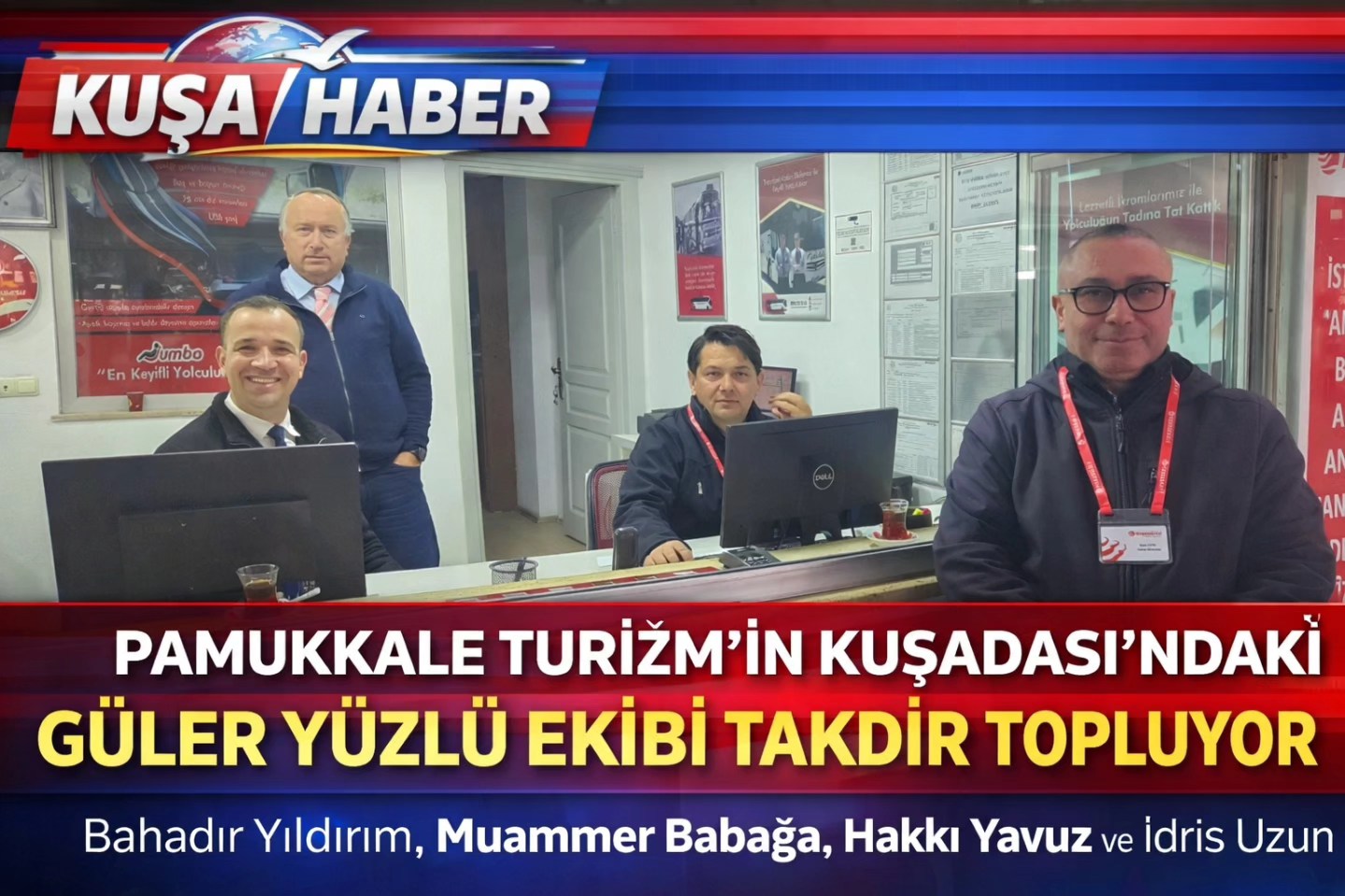 Kuşadası’nda hizmet veren Pamukkale Turizm personeli, güler yüzlü hizmet anlayışıyla yolcuların gönlünde adeta taht kurdu.Firma bünyesinde görev yapan Bahadır Yıldırım, Muammer Babağa, Hakkı Yavuz ve İdris Uzun, yolcularla kurdukları samimi…
